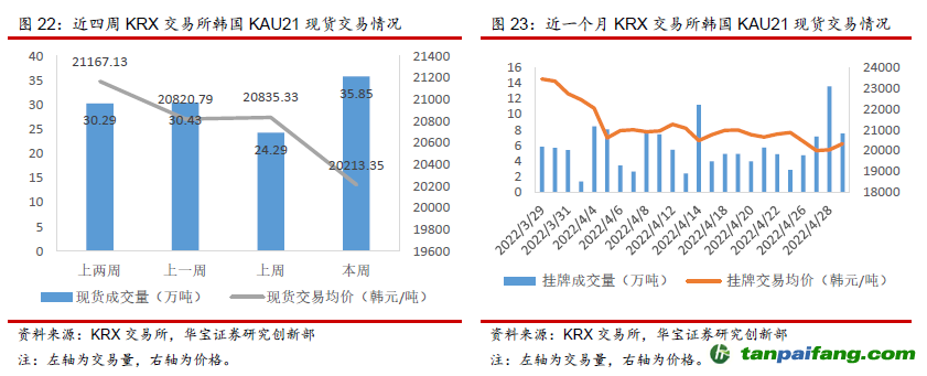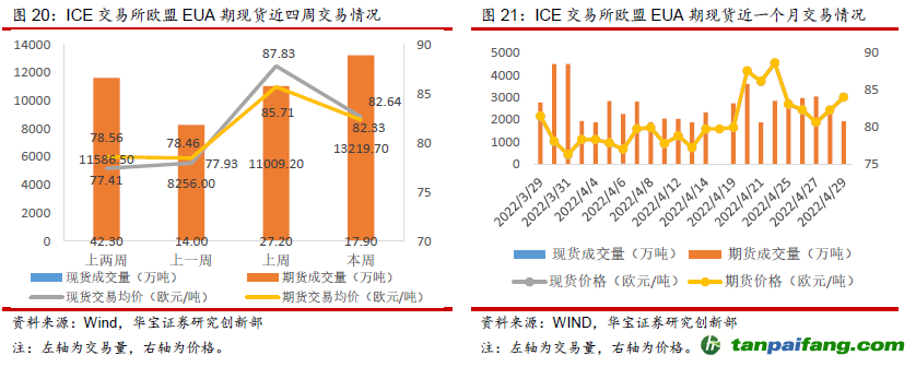 本周(4月25日-5月1日)國外碳配額二級交易市場交易量均有所上漲,但碳價回落。盡管本周歐盟碳市場臨近履約期,但平均碳價相比上周有所回落,周內(nèi)碳價仍呈現(xiàn)“V”字走勢、保持在高位,歐盟市場本周EUA現(xiàn)貨成交量下降34.19%,期貨成交量上升20.08%,期現(xiàn)貨成交均價分別下降5.90%、3.94%。韓國市場本周KAU21現(xiàn)貨成交量有所上升,漲幅為47.59%,平均碳價有所下跌,跌幅為2.99%。 本文+內(nèi)-容-來-自;中^國_碳+排.放_交^易=網(wǎng) t a n pa ifa ng .c om