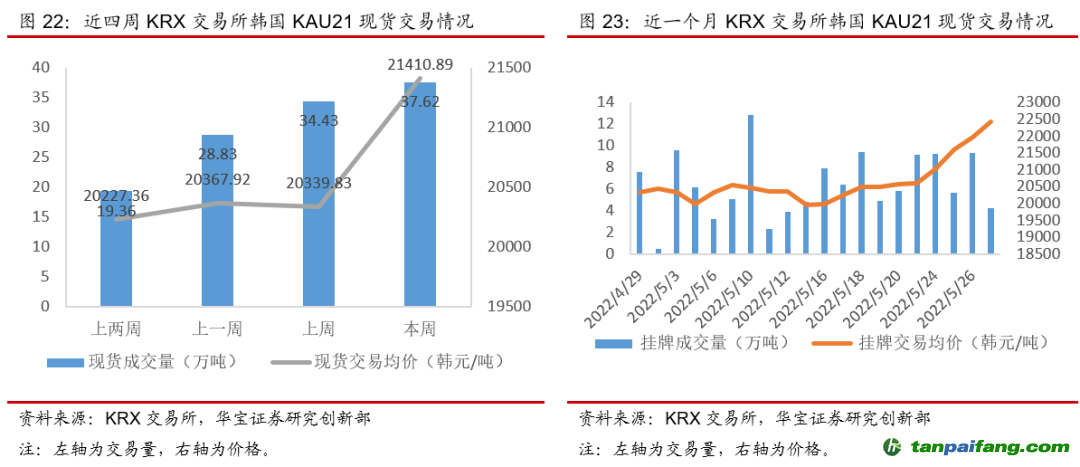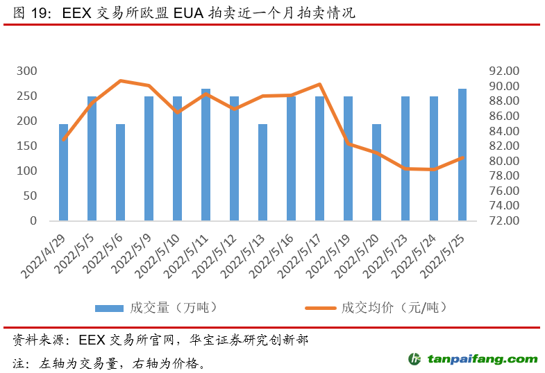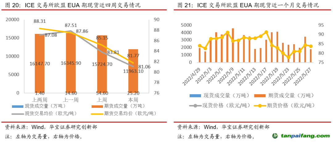 本周(5月23日-5月29日)國外碳配額二級市場交易量漲跌不一,碳價漲跌不一。歐盟市場本周EUA現貨成交量下滑53.85%,期貨成交量下滑降23.92%,現貨成交均價下降3.28%,期貨成交均價下跌3.97%,周內期現貨碳價漲幅均超7.7%,周一跌至短期地位77歐元/噸左右后呈超跌反彈趨勢,此外本周一級市場拍賣量同比上周減少19.87%,供應量的減少也對悲觀情緒的緩解起到作用。韓國市場本周KAU21現貨成交量漲幅為9.27%,平均碳價有所上漲,漲幅為5.27%,且周內碳價呈上漲趨勢。 本+文+內.容.來.自:中`國`碳`排*放*交*易^網 t a np ai fan g.com