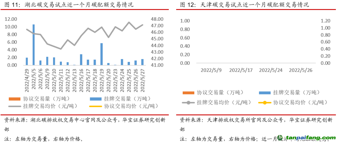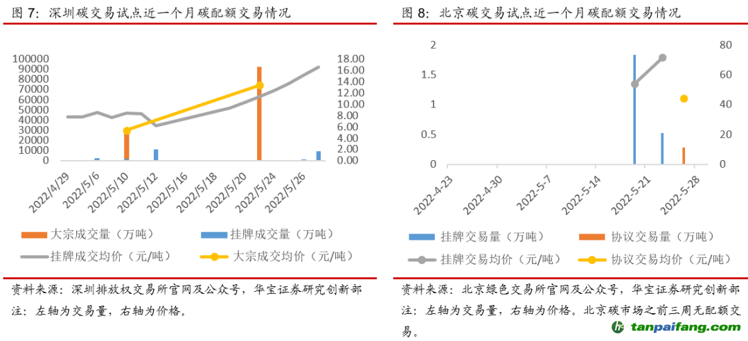 本周(5月23日-5月29日)全國整體碳配額交易市場活躍度有所提升,試點平均碳價上漲。本周碳配額二級市場成交量共計133.27萬噸,其中全國碳市場交易量55.14萬噸(含協(xié)議轉讓53.00萬噸),同比上漲175.61%,碳試點交易量78.13萬噸,同比下降23.96%,主要原因是除深圳和上海試點交易量上升,其他試點城市交易量均大幅下滑。本周碳配額二級市場成交額共計8324萬元,其中全國碳市場交易額3073萬元,同比上漲151.82%,碳試點交易額5251萬元,同比下降23.74%。從線上周均價上看,全國碳市場均價59元/噸,同比上漲1.72%,碳試點平均碳價67.21元/噸,同比上漲0.29%,主要原因是深圳、北京試點碳價漲幅較大,而交易量占比45%的廣東試點碳價基本與上周持平。 內/容/來/自:中-國/碳-排*放^交%易#網-tan p a i fang . com