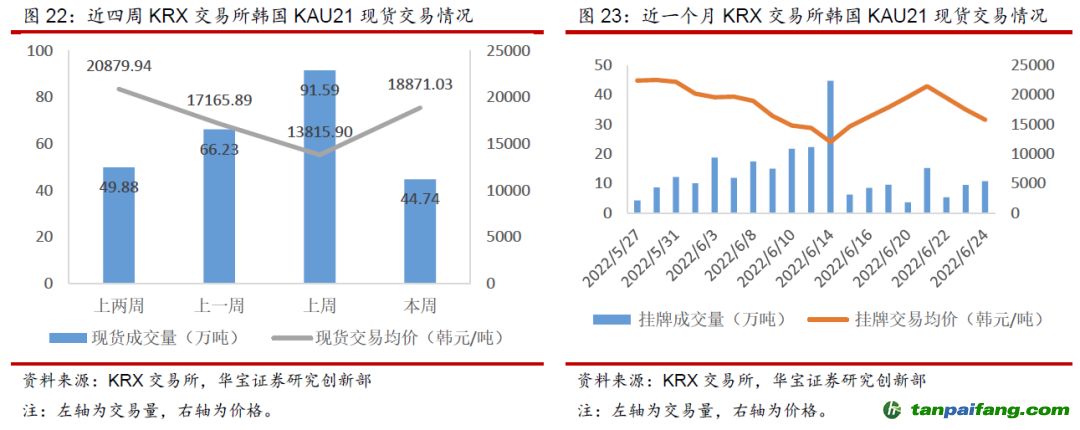 本周(6月20日-6月26日)國(guó)外碳配額二級(jí)市場(chǎng)交易量漲跌不一,碳價(jià)漲跌不一。歐盟市場(chǎng)本周EUA拍賣量同比增長(zhǎng)30.1%,拍賣周均價(jià)上漲0.16%,周內(nèi)呈震蕩走勢(shì);EUA現(xiàn)貨成交量增長(zhǎng)121.70%,期貨成交量增長(zhǎng)3.31%,現(xiàn)貨成交均價(jià)小幅增長(zhǎng)0.02%,期貨成交均價(jià)小幅下跌0.06%,周內(nèi)期現(xiàn)貨碳價(jià)呈震蕩走勢(shì),本周三歐盟碳市場(chǎng)以及碳邊境調(diào)節(jié)機(jī)制草案修正案通過(guò)歐洲議會(huì)投票,相比歐洲議會(huì)環(huán)境、公共衛(wèi)生和食品安全委員會(huì)通過(guò)的方案,本次通過(guò)的方案略有緩和,包括推遲了碳邊境調(diào)節(jié)機(jī)制的正式征收時(shí)間、免費(fèi)配額比例削減為0%的時(shí)間等等,故周三碳價(jià)有所下跌,但此次方案的通過(guò)仍舊表明歐盟碳市場(chǎng)變革的決心和政策趨嚴(yán)的事實(shí),故碳價(jià)依舊維持高位震蕩。韓國(guó)市場(chǎng)本周KAU21現(xiàn)貨成交量大幅下跌,跌幅為51.15%,但平均碳價(jià)上漲36.59%。 禸嫆@唻洎:狆國(guó)湠棑倣茭昜蛧 τāńpāīfāńɡ.cōm