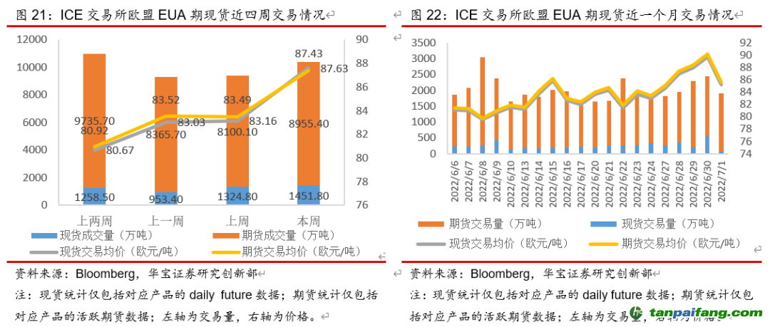 本周(6月27日-7月3日)國外碳配額二級市場交易量漲跌不一,碳價均有所上漲。歐盟市場本周EUA拍賣量同比減少3.15%,拍賣周均價上漲3.11%,周內呈上漲走勢,但本周五投標倍數相比周一至周四平均投標倍數下降約16%,一級市場表現(xiàn)疲軟;二級市場EUA期現(xiàn)貨成交量分別增長10.56%、9.59%,期現(xiàn)貨成交均價分別上漲4.71%、5.37%,周內期現(xiàn)貨碳價呈“倒V”走勢,周一至周四延續(xù)上一周歐盟碳市場修正案通過歐洲議會投票對碳市場的積極影響,周四EUA期貨成交均價重回90歐元/噸,但周五受一級市場影響、價格下跌。英國二級市場本周UKA期現(xiàn)貨成交量與碳價均有所增長,期現(xiàn)貨成交量分別增長106.83%、282.53%,期現(xiàn)貨碳價分別增長3.29%、3.09%,周內碳價也呈上漲趨勢。韓國市場本周KAU21現(xiàn)貨成交量繼續(xù)下降,減少23.93%,但平均碳價上漲2.89%。