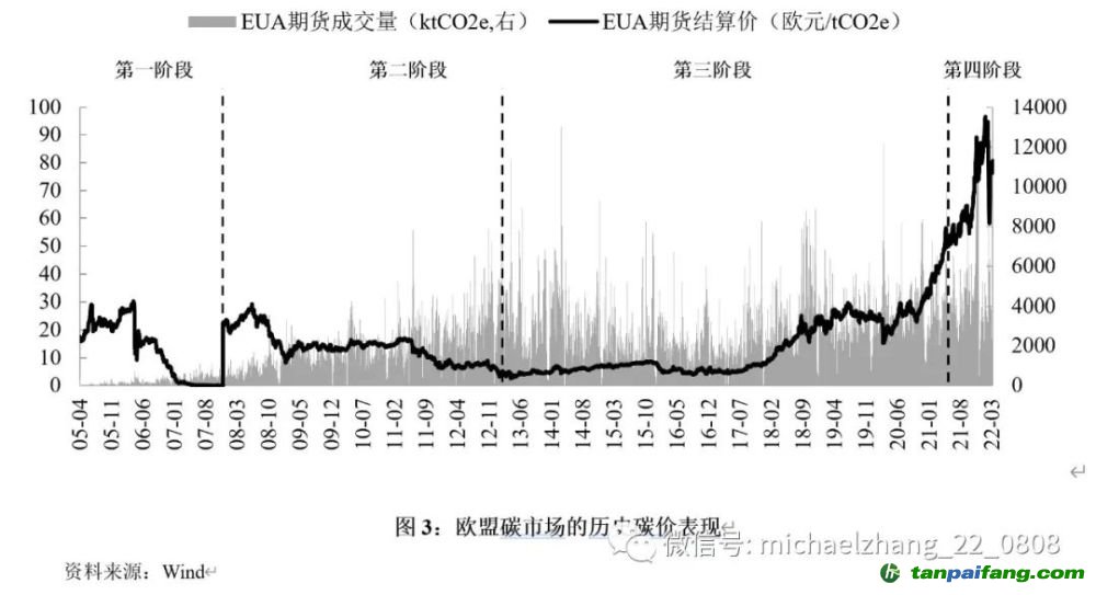 歐盟碳市場的交易對象以碳期貨為主,其碳價