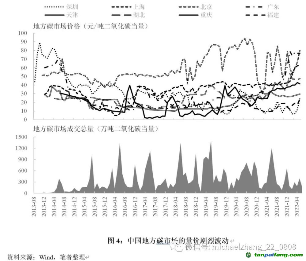 究其原因,一方面是中國基于碳強度的總量設(shè)定與“基準線+預(yù)發(fā)放”的配額分配方式,導(dǎo)致企業(yè)在履約期內(nèi)并不確定實際需上繳的最終碳配額(僅有預(yù)發(fā)放配額可供參照),因此企業(yè)通常傾向于臨近履約期末才進行交易。另一方面,國內(nèi)碳市場金融工具運用不足,價格發(fā)現(xiàn)及穩(wěn)定市場的作用發(fā)揮有限;而部分地方市場雖設(shè)置了價格限制、持倉限制、成本控制儲備等市場調(diào)節(jié)機制,但實際效果不佳,碳價整體波動仍然較大。 內(nèi).容.來.自:中`國`碳#排*放*交*易^網(wǎng) t a np ai f an g.com