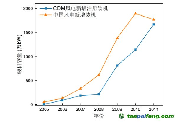 (圖1)2005-2011中國風(fēng)電與CDM風(fēng)電新增裝機(jī)容量圖源:網(wǎng)絡(luò) 內(nèi).容.來.自:中`國*碳-排*放*交*易^網(wǎng) t a npai fa ng.com