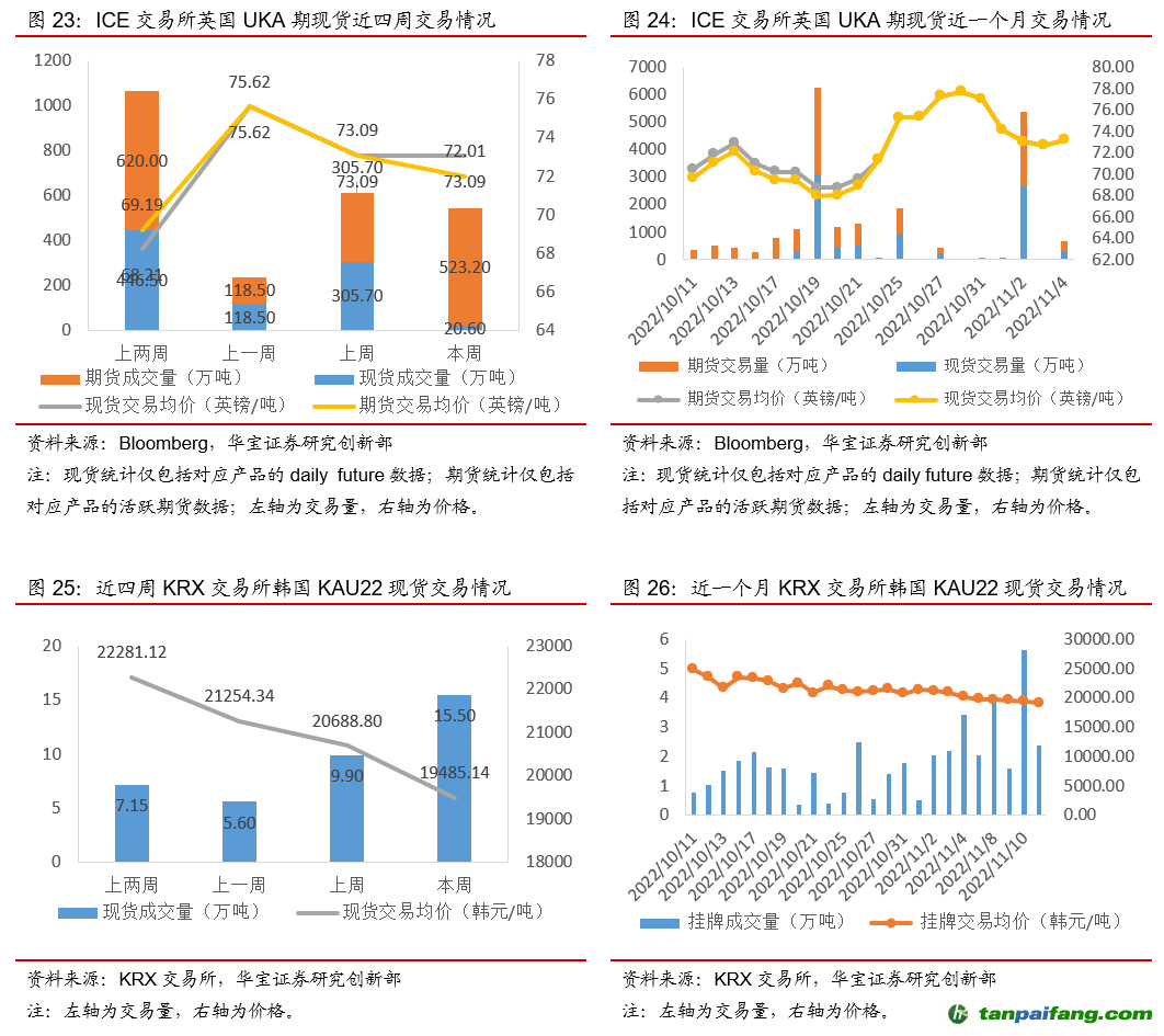本周(11月7日-11月13日)國外碳配額二級市場交易量漲跌不一。歐盟本周一級市場拍賣量1249.5萬噸,同比上升33.02%,拍賣周均價74.7歐元/噸,相比上周小幅下降4.27%。歐盟二級市場EUA本周總成交量同比上升14.16%,本周平均期現(xiàn)價格分別下跌3.14%、3.72%。周內(nèi)歐盟碳價呈“V”型走勢,隨著聯(lián)合國COP27峰會的開幕,歐盟在氣候治理議題上有更新動作,包括:本周二歐盟議會和理事會談判代表就修訂《努力分擔(dān)法規(guī)》(ESR)達(dá)成了臨時協(xié)議,該法規(guī)為歐盟成員國設(shè)定了具有約束力的年度溫室氣體減排量,意味著歐盟所有國家都將承擔(dān)10-50%的減排目標(biāo);本周四歐洲議會通過投票將REPowerEU措施納入國家復(fù)蘇計劃,以支持獨立于俄羅斯化石燃料并加速綠色轉(zhuǎn)型;本周四歐洲議會和歐盟理事會談判代表就“Fit for 55”一攬子計劃的第三份文件達(dá)成了臨時協(xié)議,同意提高歐盟土地利用和林業(yè)部門的碳匯目標(biāo),將歐盟2030年溫室氣體減排目標(biāo)提高到57%。以上消息對歐盟碳市場有所提振。本周英國二級市場UKA期貨交易量大幅上漲,同比上升71.15%,交易均價同比下降1.48%,UKA現(xiàn)貨交易量大幅下降,同比減少93.26%,交易均價同比持平。本周韓國碳市場KAU22現(xiàn)貨成交量大幅上漲,同比上升56.58%,平均碳價有所下探,同比下降5.82%,周內(nèi)碳價呈下跌趨勢。 本+文+內(nèi).容.來.自:中`國`碳`排*放*交*易^網(wǎng) t a np ai fan g.com