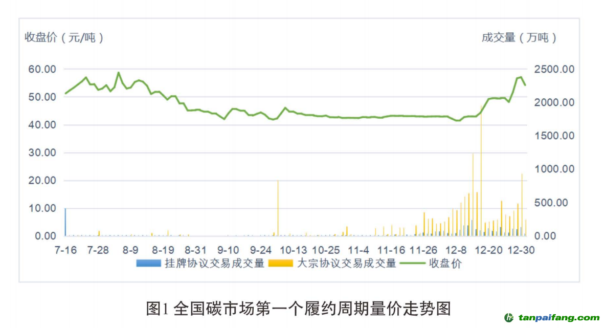 截至2021年12月31日,第一個(gè)履約周期共運(yùn)行114個(gè)交易日,碳排放配額累計(jì)成交量1.79億噸,累計(jì)成交金額76.61億元,成交均價(jià)42.85元/噸,每日收盤(pán)價(jià)在40~60元/噸之間波動(dòng),價(jià)格總體穩(wěn)中有升。 本+文`內(nèi).容.來(lái).自:中`國(guó)`碳`排*放*交*易^網(wǎng) t a np ai fan g.com