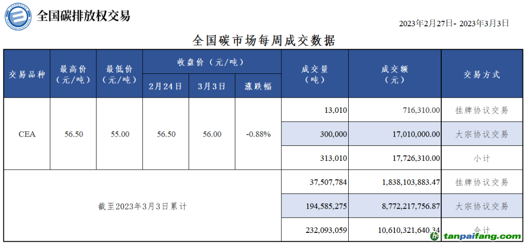 截至本周,全國碳市場碳排放配額(CEA)累計成交量232,093,059噸,累計成交額10,610,321,640.34元。