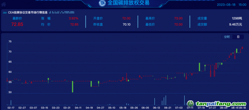 據(jù)上海環(huán)境(601200)能源交易所公開信息,8月18日,全國碳市場碳排放配額收盤價72.85元/噸,較前一交易日上漲3.92%。過去一周的5個交易日中,