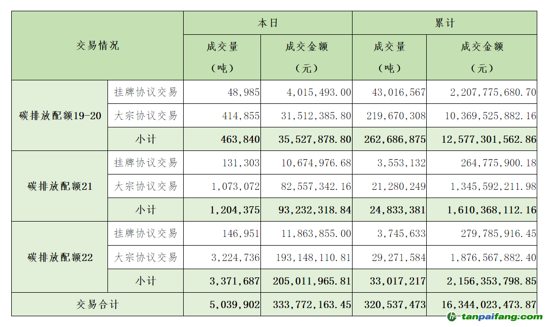截至今日,全國碳排放權(quán)交易市場累計成交總量320,537,473噸,累計成交總額16,344,023,473.87元。