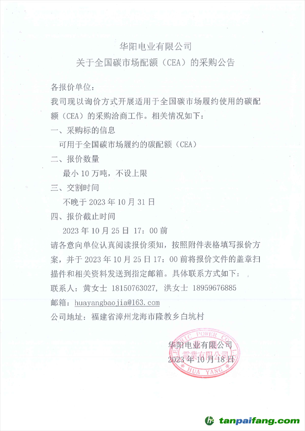 最小10萬噸,不設(shè)上限!華陽電業(yè)全國碳配額(CEA)采購公告