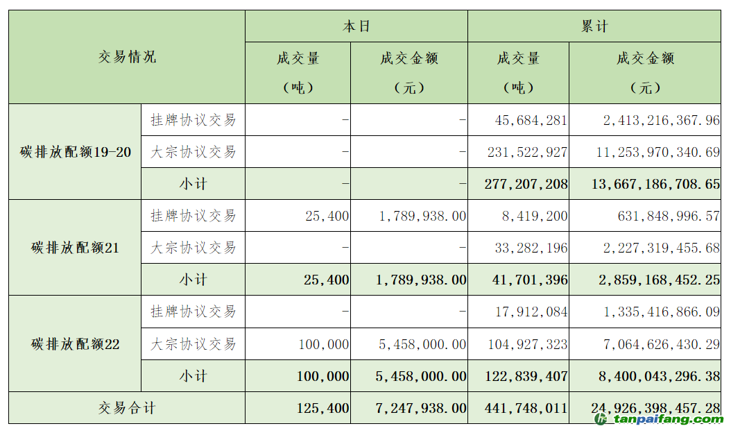 截至今日,全國(guó)碳排放權(quán)交易市場(chǎng)累計(jì)成交總量441,748,011噸,累計(jì)成交總額24,926,398,457.28元。 內(nèi).容.來.自:中`國(guó)`碳#排*放*交*易^網(wǎng) t a np ai f an g.com