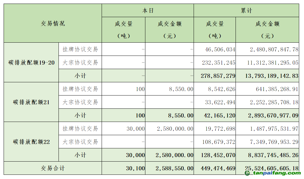 截至今日,全國碳排放權交易市場累計成交總量449,474,469噸,累計成交總額25,524,605,605.18元。 內(nèi)/容/來/自:中-國-碳-排-放*交…易-網(wǎng)-tan pai fang . com