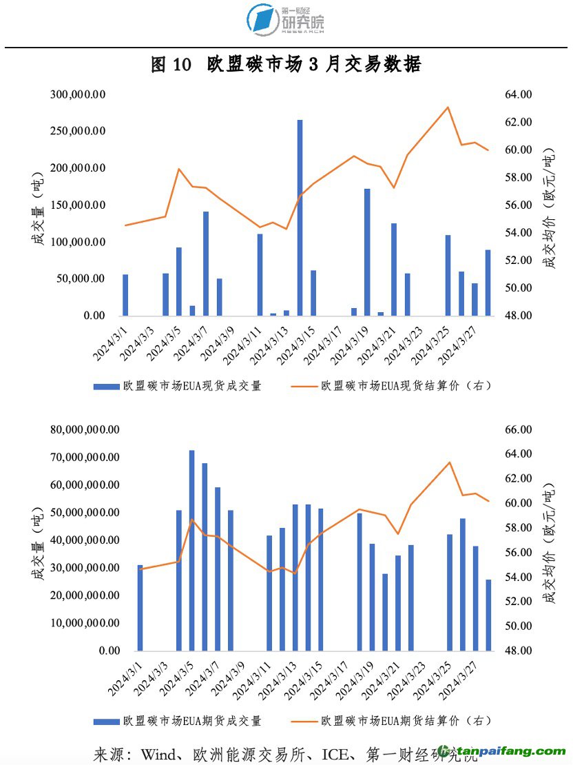 3月歐盟碳排放配額(EUA)現(xiàn)貨成交量154.20萬(wàn)噸,期貨成交量9.21億噸。3月EUA現(xiàn)貨結(jié)算價(jià)最低54.29歐元/噸,最高63.08歐元/噸;期貨結(jié)算價(jià)最低54.31歐元/噸,最高63.34歐元/噸。