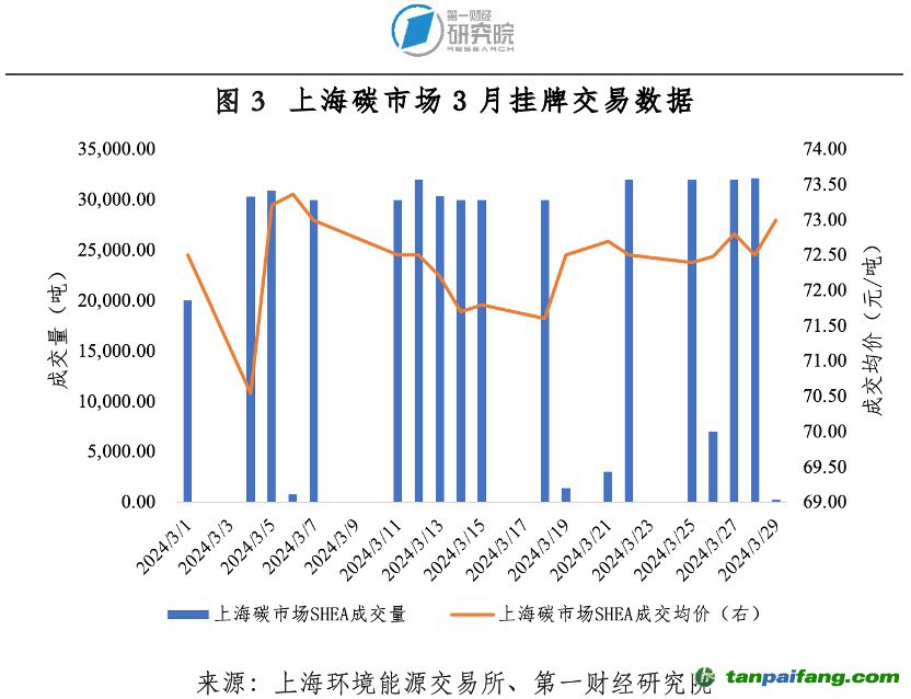 3月上海碳市場(chǎng)碳排放配額(SHEA)掛牌交易成交量43.41萬(wàn)噸,成交額3137.77萬(wàn)元,成交均價(jià)72.28元/噸。3月最后一個(gè)交易日成交均價(jià)73.00元/噸,較2月最后一個(gè)交易日成交均價(jià)72.00元/噸上漲1.39%。截至3月31日,SHEA累計(jì)成交量5086.06萬(wàn)噸(掛牌交易2173.29萬(wàn)噸,協(xié)議轉(zhuǎn)讓2912.78萬(wàn)噸),累計(jì)成交額14.02億元。 本%文$內(nèi)-容-來(lái)-自;中_國(guó)_碳|排 放_(tái)交-易^網(wǎng)^t an pa i fang . c om