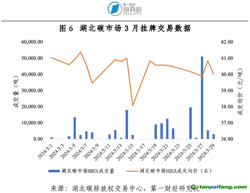 3月湖北碳市場(chǎng)碳排放配額(HBEA)掛牌交易成交量17.51萬(wàn)噸,成交額706.71萬(wàn)元。期間,最高價(jià)44.44元/噸,最低價(jià)36.54元/噸,成交均價(jià)40.35元/噸。3月最后一個(gè)交易日收盤(pán)價(jià)40.02元/噸,較2月最后一個(gè)交易日收盤(pán)價(jià)40.88元/噸下跌2.10%。截至3月31日,HBEA(不包括遠(yuǎn)期和拍賣(mài))累計(jì)成交量1.17億噸,累計(jì)成交額30.13億元。 本/文-內(nèi)/容/來(lái)/自:中-國(guó)-碳-排-放-網(wǎng)-tan pai fang . com