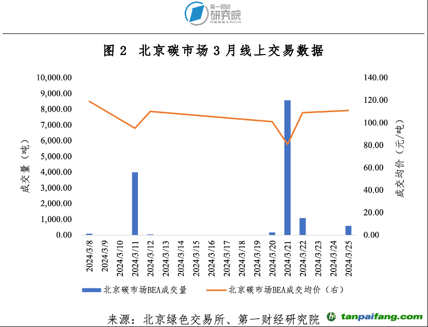 3月北京碳市場(chǎng)碳排放配額(BEA)線上成交量14569噸,成交額129.19萬(wàn)元,成交均價(jià)88.68元/噸。3月最后一個(gè)交易日成交均價(jià)111.00元/噸,較2月最后一個(gè)交易日成交均價(jià)115.00元/噸下跌3.48%。截至3月31日,BEA累計(jì)成交量5498.42萬(wàn)噸(公開(kāi)交易1954.09萬(wàn)噸,協(xié)議轉(zhuǎn)讓3544.33萬(wàn)噸),累計(jì)成交額28.34億元。 禸嫆@唻洎:狆國(guó)湠棑倣茭昜蛧 τāńpāīfāńɡ.cōm