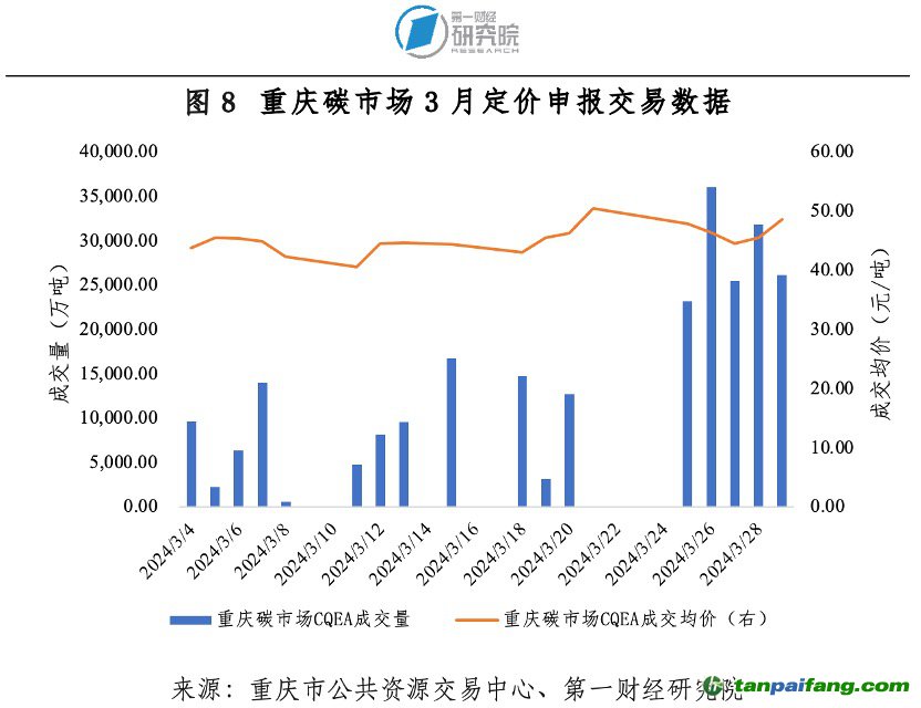 3月重慶碳市場(chǎng)碳排放配額(CQEA)定價(jià)申報(bào)交易成交量24.50萬(wàn)噸,成交金額1117.05萬(wàn)元;成交申報(bào)交易成交量139.27萬(wàn)噸,成交金額5673.84萬(wàn)元。