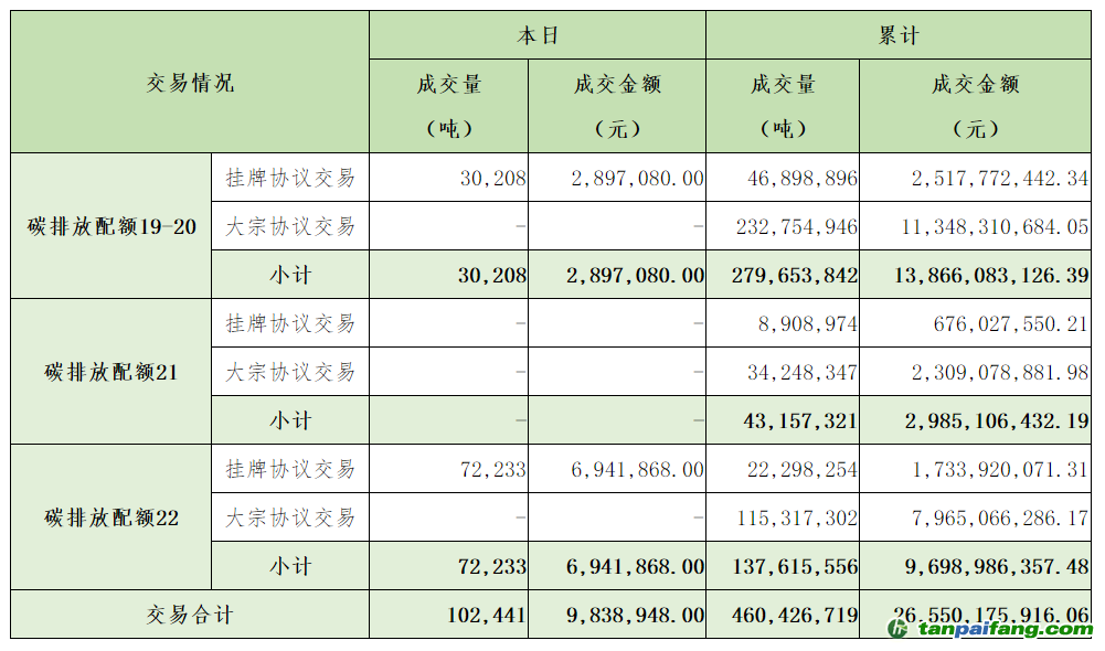 截至今日,全國碳排放權(quán)交易市場累計成交總量460,426,719噸,累計成交總額26,550,175,916.06元。