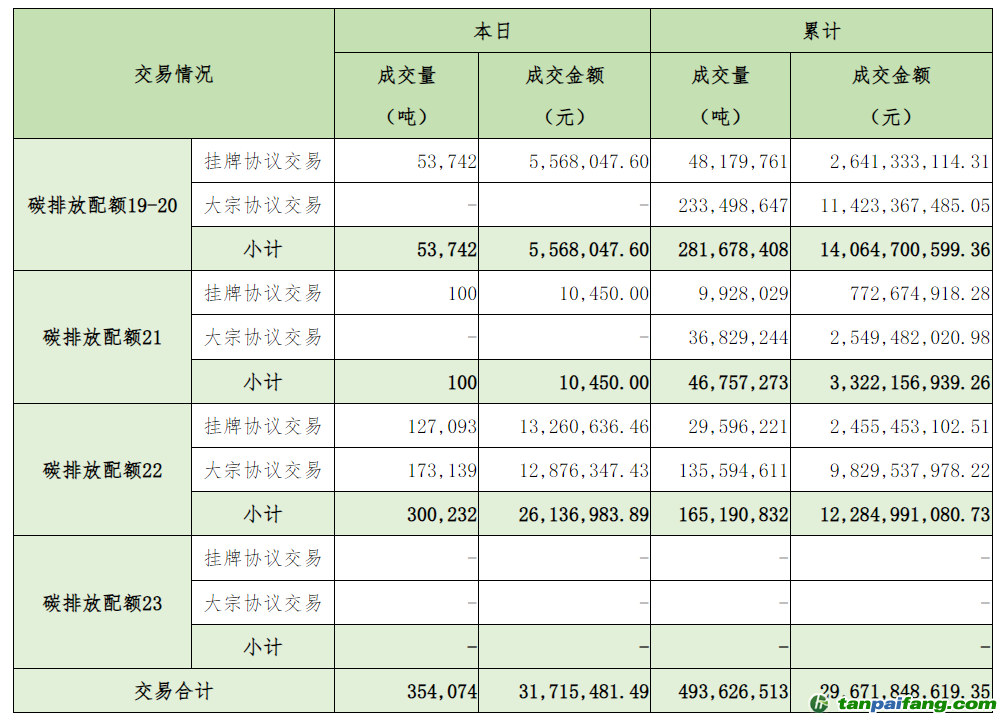 截至今日,全國(guó)碳排放權(quán)交易市場(chǎng)累計(jì)成交總量493,626,513噸,累計(jì)成交總額29,671,848,619.35元。