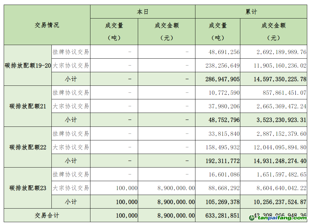 截至今日,全國碳排放權(quán)交易市場累計(jì)成交總量633,281,851噸,累計(jì)成交總額43,308,066,948.36元。 內(nèi).容.來.自:中`國`碳#排*放*交*易^網(wǎng) t a np ai f an g.com