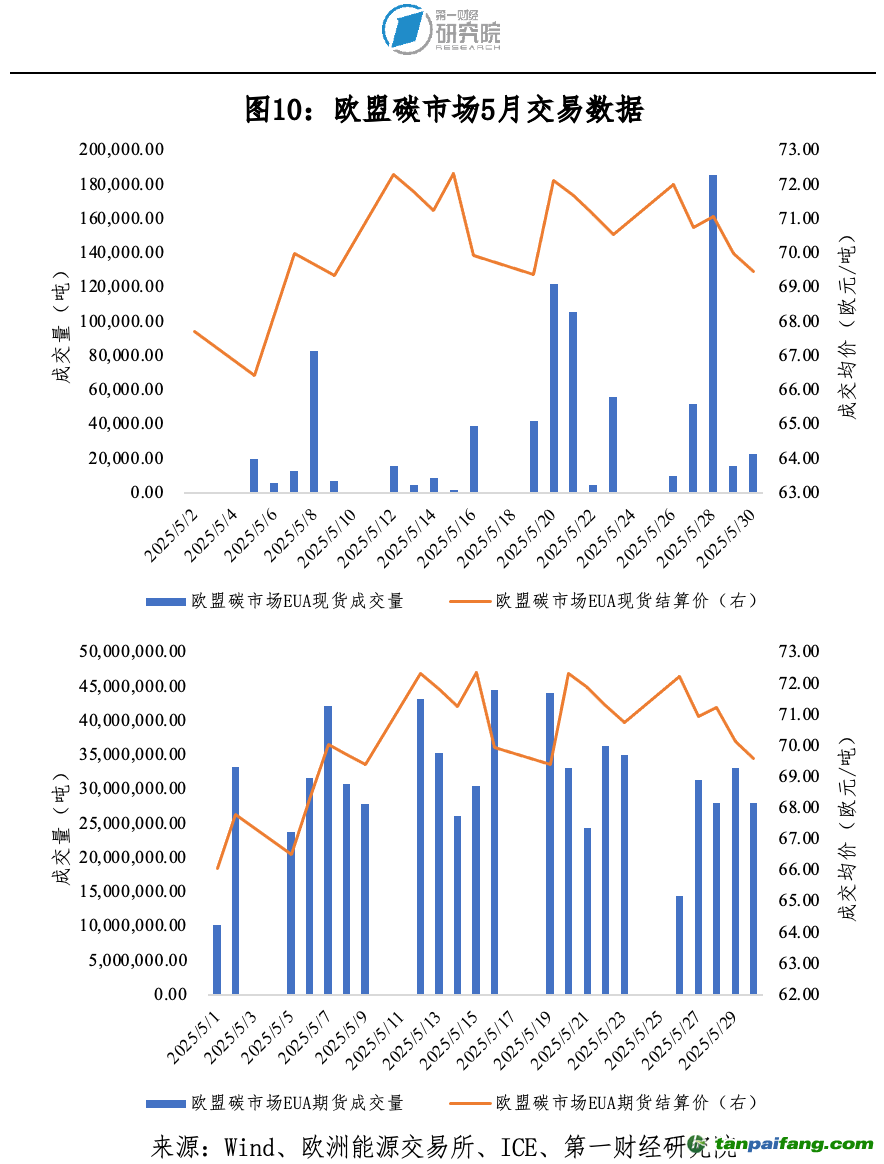 5月EUA現(xiàn)貨成交量81.80萬(wàn)噸,結(jié)算價(jià)最低66.45歐元/噸,最高72.34歐元/噸;期貨成交量6.89億噸,結(jié)算價(jià)最低66.08歐元/噸,最高72.36歐元/噸。