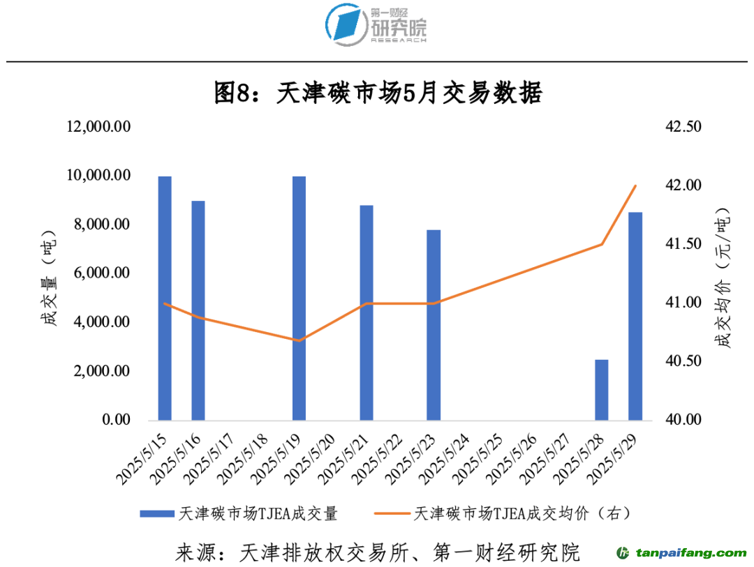 5月天津碳市場(chǎng)碳排放配額(TJEA)總成交量56630噸,總成交額232.73萬(wàn)元,均為競(jìng)價(jià)交易,無(wú)協(xié)議交易發(fā)生。截至5月31日,TJEA累計(jì)成交量4546.70萬(wàn)噸,累計(jì)成交額11.62億元。