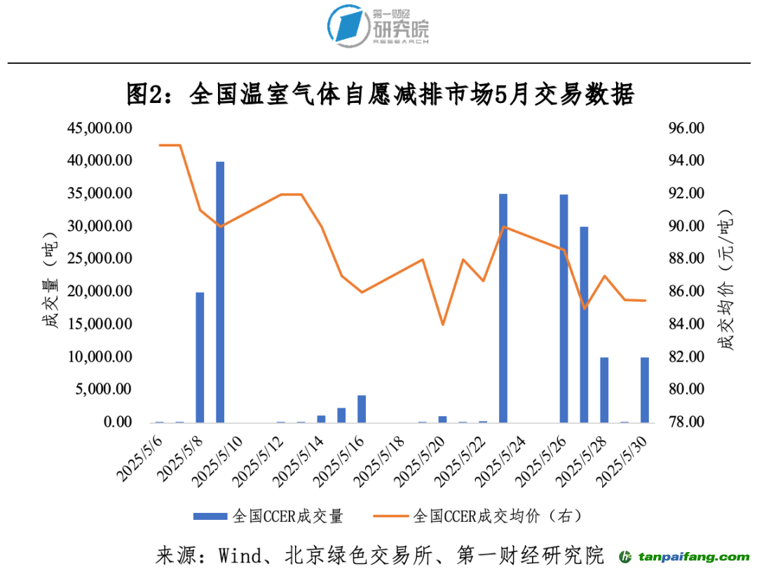 5月,全國(guó)碳市場(chǎng)碳排放配額(CEA)掛牌協(xié)議成交均價(jià)為70.26元/噸,較4月下跌10.89%。由于未到履約期,碳配額供大于求,疊加節(jié)假日因素,月末CEA價(jià)格已跌至70元/噸以下,創(chuàng)年內(nèi)新低。 本`文@內(nèi)/容/來(lái)/自:中-國(guó)^碳-排-放^*交*易^網(wǎng)-tan pai fang. com