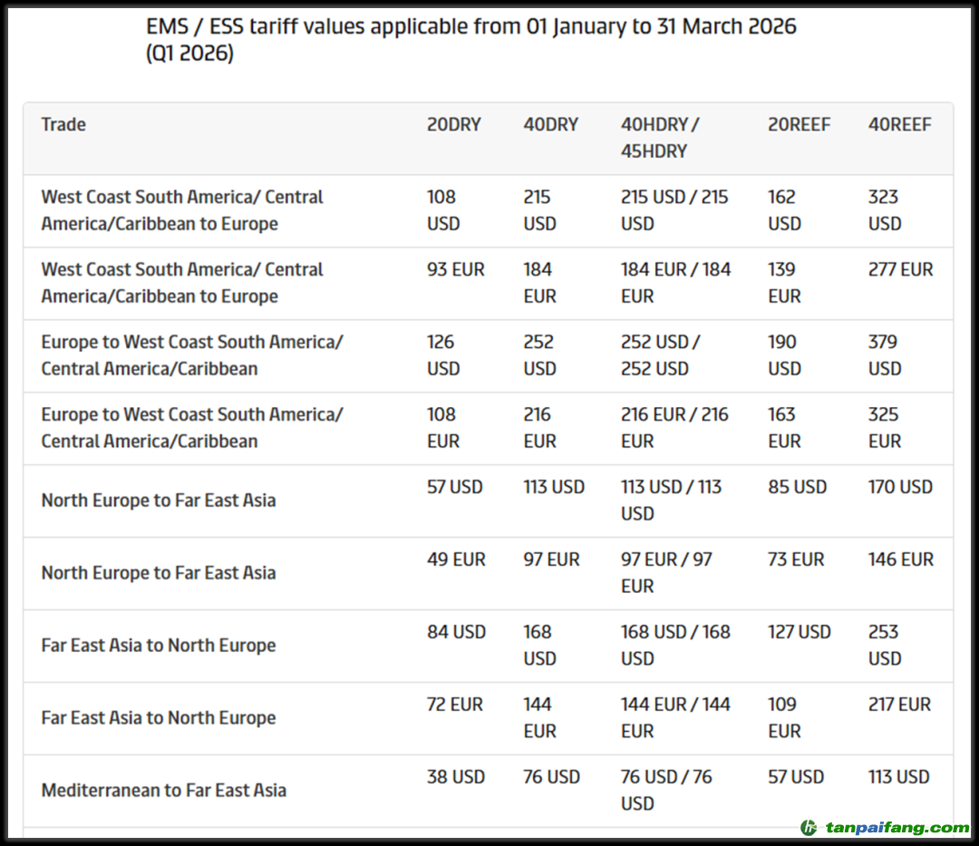 與此同時(shí),主要航運(yùn)公司也對(duì)2026年的歐盟排放附加費(fèi)進(jìn)行了調(diào)整。馬士基對(duì)這一附加費(fèi)的上漲解釋稱: