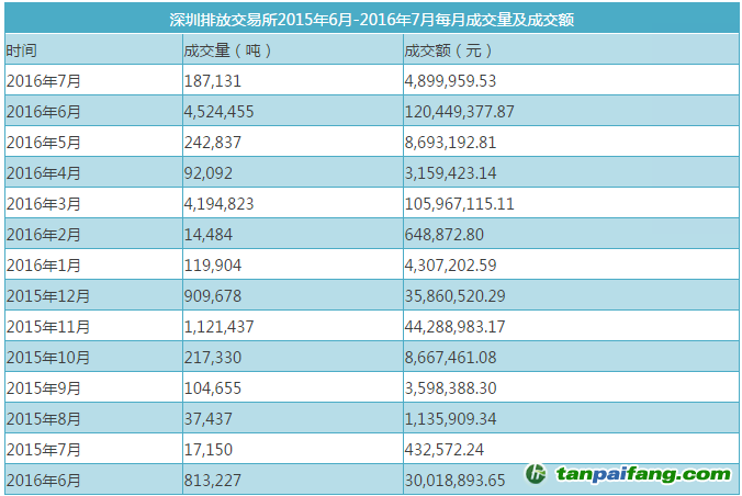 截止2016年9月12日,深圳排放交易所累計(jì)成交量近1576萬噸,累計(jì)成交額5.4億元。2015年-2016年,隨著深圳排放交易試點(diǎn)的不斷發(fā)展,成交量和成交額相對(duì)往年都有大幅增加。2015年6月-2016年7月,交易所成交量累計(jì)達(dá)1260萬噸,累計(jì)成交額達(dá)3.7億噸。