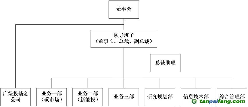 碳排放權(quán)交易所實行董事會領(lǐng)導(dǎo)下的總裁負責制,組織架構(gòu)如圖所示。