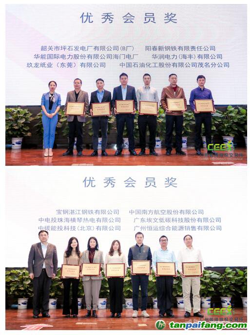 CCER交易績優(yōu)獎”;上海盈碳環(huán)境技術(shù)咨詢有限公司、廣州綠石碳科技股份有限公司榮獲“市場潛力獎”;廣東省低碳產(chǎn)業(yè)技術(shù)協(xié)會、深圳中碳事業(yè)新能源環(huán)境科技有限公司榮獲“會員開拓先鋒獎”;廣東省低碳發(fā)展促進(jìn)會、阿拉善SEE珠江項目中心、中國質(zhì)量認(rèn)證中心榮獲“低碳公益服務(wù)先鋒獎”;韶關(guān)市坪石發(fā)電廠有限公司(B)廠、陽春新鋼鐵有限責(zé)任公司、華能國際電力股份有限公司海門電廠、華潤電力(海豐)有限公司、玖龍紙業(yè)(東莞)有限公司、中國石油化工股份有限公司茂名分公司、寶鋼湛江鋼鐵有限公司、中國南方航空股份有限公司、中電投珠海橫琴熱電有限公司、廣東埃文低碳科技股份有限公司、中碳能投科技有限公司、廣州恒運綜合能源銷售有限公司11家控排單位、5家非控排單位和5名個人會員獲選為廣碳所優(yōu)秀會員。微碳(廣州)低碳科技有限公司、北京太銘基業(yè)投資咨詢有限公司、柏能新能源(深圳)有限公司、國泰君安證券股份有限公司、碧辟(中國)投資有限公司獲頒最佳市場貢獻(xiàn)獎。