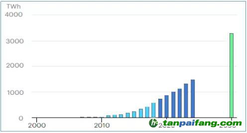 IEA對太陽能光伏發(fā)電量的預(yù)計(jì)2000-2030