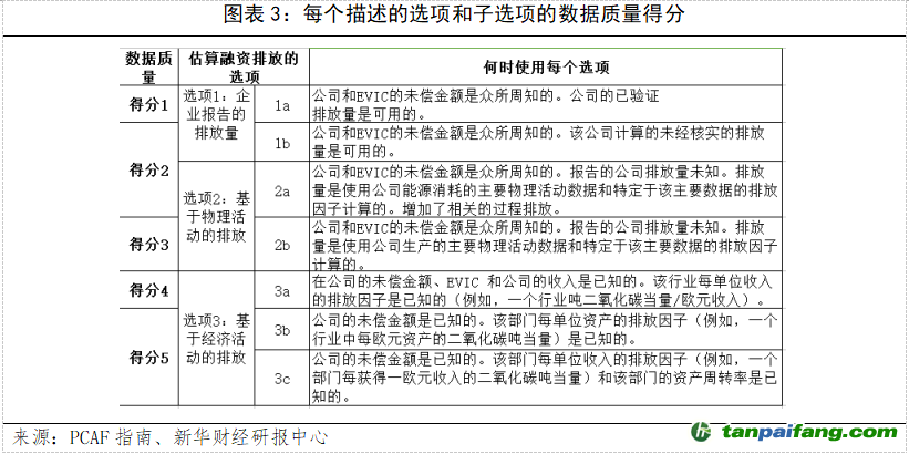從數(shù)據(jù)質(zhì)量的角度來看,選項1和2優(yōu)于選項3——它們?yōu)榻鹑跈C構(gòu)提供更準確的排放結(jié)果。由于數(shù)據(jù)限制,金融機構(gòu)可能對某些公司使用選項1或2,而對其他公司使用選項3。下表提供了每個描述的選項和子選項(如果適用)的數(shù)據(jù)質(zhì)量得分,可用于計算上市股票和公司債券的融資排放。 本%文$內(nèi)-容-來-自;中_國_碳|排 放_交-易^網(wǎng)^t an pa i fang . c om