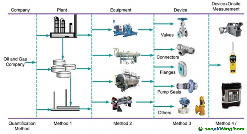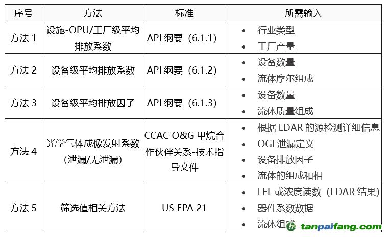 盡管石油和天然氣行業(yè)非常建議估算和控制逸散性排放,但用于逸散性排放量化的全球逸散性排放標準是非約束性指南,而不是規(guī)則、法規(guī)或政策;其中行業(yè)可以自由使用任何方法來估算逸散性排放。盡管如此,石油和天然氣行業(yè)仍在不斷努力制定甲烷排放測量法規(guī),以進行有效監(jiān)測并最終設定減排目標。用于估計排放量的方法的選擇取決于如何使用估計值以及所需的準確度。相對于精度而言,使用來自直接測量的站點特定數(shù)據(jù)的方法優(yōu)于其他方法。下表顯示了逸散性排放量化方法。 本`文-內(nèi).容.來.自:中`國^碳`排*放*交^易^網(wǎng) ta np ai fan g.com