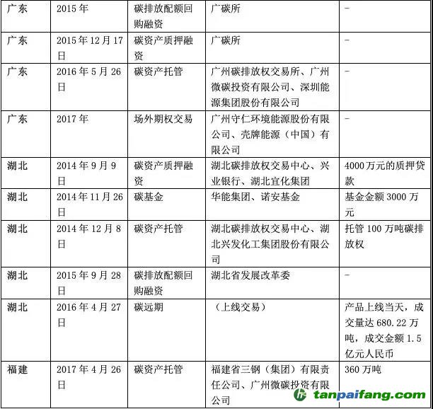 、碳掉期、碳遠(yuǎn)期等,但產(chǎn)品數(shù)量不多,金額也不大。已推出的一些金融產(chǎn)品情況如下表所示: