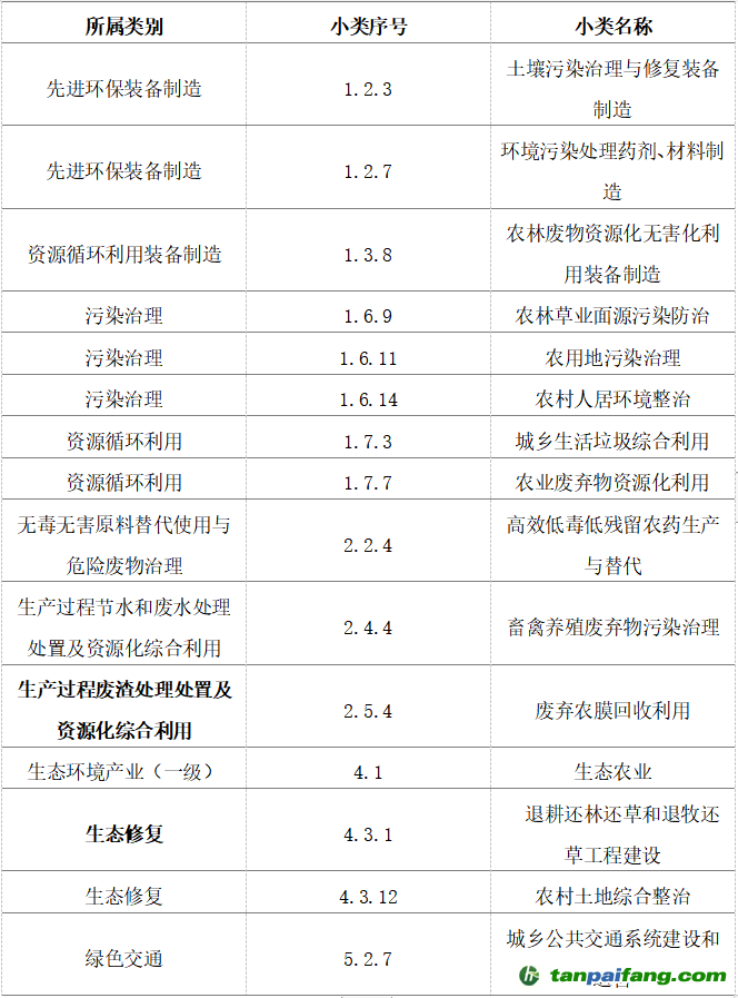 發(fā)展綠色普惠金融首先要明確服務(wù)對(duì)象和涵蓋領(lǐng)域。參考農(nóng)業(yè)銀行出臺(tái)的《2019年普惠金融信貸政策指引》對(duì)綠色產(chǎn)業(yè)中的優(yōu)質(zhì)小微企業(yè)提供支持的政策引導(dǎo)以及綠色金融與綠色惠普的概念,本文將綠色普惠金融服務(wù)對(duì)象確定為三農(nóng)、中小微企業(yè)開展的與環(huán)境改善、應(yīng)對(duì)氣候變化和資源節(jié)約高效利用等有關(guān)的綠色產(chǎn)業(yè)或項(xiàng)目。本文重點(diǎn)就《綠色產(chǎn)業(yè)指導(dǎo)目錄(2019年版)》中與“三農(nóng)”相關(guān)的議題做簡(jiǎn)要梳理。