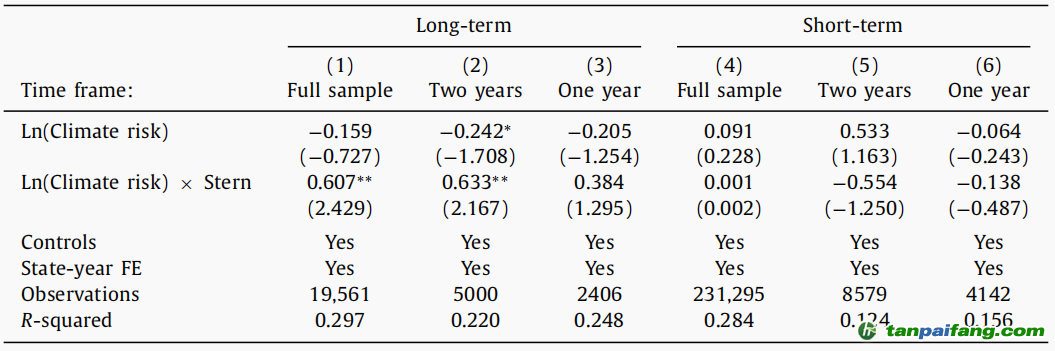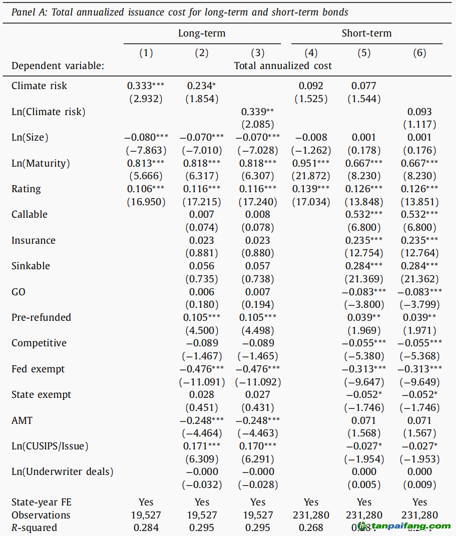 表2顯示出了模型的回歸結(jié)果,將債券發(fā)行期限高于25年作為長期債券,低于25年為短期債券?;貧w結(jié)果顯示:長期市政債券的發(fā)行成本與氣候變化風(fēng)險顯著相關(guān),短期市政債券的發(fā)行成本與氣候變化風(fēng)險無顯著關(guān)系。 本`文@內(nèi)-容-來-自;中^國_碳0排0放^交-易=網(wǎng) ta n pa i fa ng . co m
