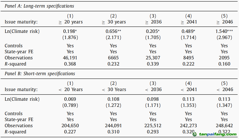 文章檢驗了不同期限結(jié)構(gòu)對氣候變化風(fēng)險與市政債券發(fā)行成本關(guān)系的影響差異。在進(jìn)行檢驗時,作者改變了長期和短期債券的定義,首先檢驗當(dāng)長期債券被確定為20年或20年以上時,結(jié)果是否仍然成立。之后作者又重復(fù)進(jìn)行檢驗,使用30年的截止日期,并將最大到期日期更改為2036、2041和2046。面板A顯示,無論債券期限結(jié)構(gòu)如何,氣候風(fēng)險都與長期市政債券的年化發(fā)行成本密切相關(guān),檢驗結(jié)果見表3。 本*文@內(nèi)-容-來-自;中_國_碳^排-放*交-易^網(wǎng) t an pa i fa ng . c om