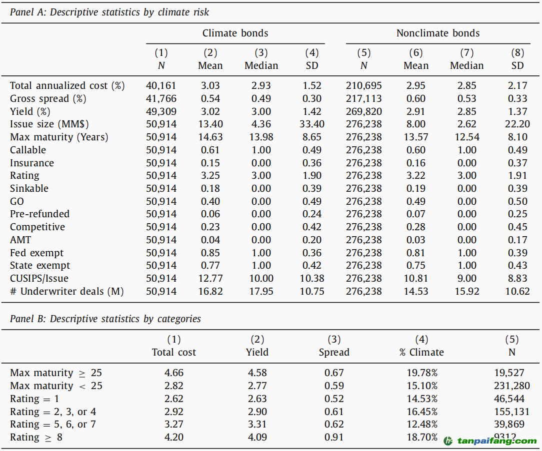 表1顯示出了數(shù)據(jù)變量的統(tǒng)計信息,由panel A的結(jié)果可知,氣候債券的平均成本為3.03%,非氣候債券的平均發(fā)行成本為2.95%。由panel B可知,期限超過25年的債券,無論是總發(fā)行成本、發(fā)行率、利差還是氣候風(fēng)險的指標(biāo)上都高于期限低于25年的債券。 內(nèi)/容/來/自:中-國/碳-排*放^交%易#網(wǎng)-tan p a i fang . com