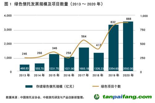 綠色信托的資產(chǎn)管理規(guī)模從2013年末的468.83億元快速增長至2020年末的3592.82億元,同比增長7.1%,新增規(guī)模為1199.93億元;存續(xù)項(xiàng)目數(shù)量為888個(gè),同比增長6.73%,新增項(xiàng)目數(shù)量360個(gè)。這充分說明綠色信托的經(jīng)濟(jì)價(jià)值、社會(huì)價(jià)值和環(huán)境價(jià)值愈發(fā)促成信托行業(yè)的共識(shí)和共建,成為信托行業(yè)服務(wù)實(shí)體經(jīng)濟(jì)的顯著本源業(yè)務(wù)。