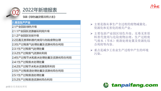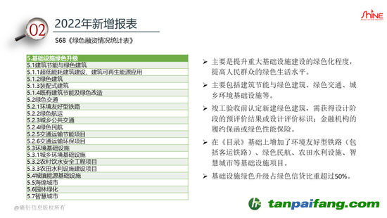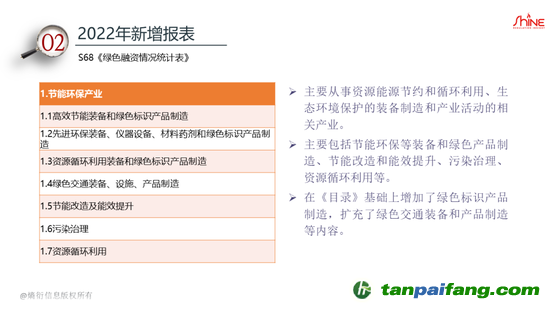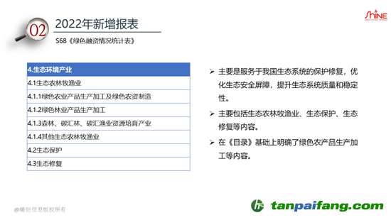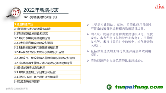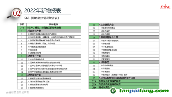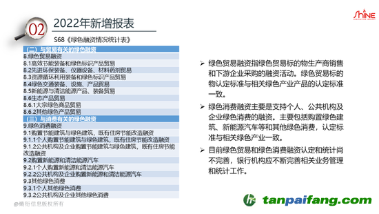 2022年新增S68《綠色融資情況統(tǒng)計(jì)表》,主要指標(biāo)來(lái)源于T115報(bào)表,統(tǒng)計(jì)口徑與T115報(bào)表基本一致,但在統(tǒng)計(jì)內(nèi)容上進(jìn)行了縮減,無(wú)需統(tǒng)計(jì)綠色信貸節(jié)能減排量數(shù)據(jù),報(bào)表合計(jì)欄目和附錄也做了簡(jiǎn)化。