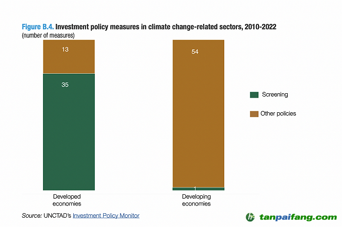無論是發(fā)達(dá)國家還是發(fā)展中國家,對可再生能源和電力部門的集中投資都很普遍。調(diào)查發(fā)現(xiàn),在2010年1月-2022年6月期間,全球有103項(xiàng)影響氣候變化相關(guān)部門外國直接投資的國家政策措施被采納。其中,60%集中在可再生能源和電力部門。