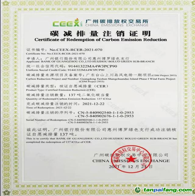 惠州“零碳網(wǎng)點”——惠州博羅綠色支行碳減排注銷證明