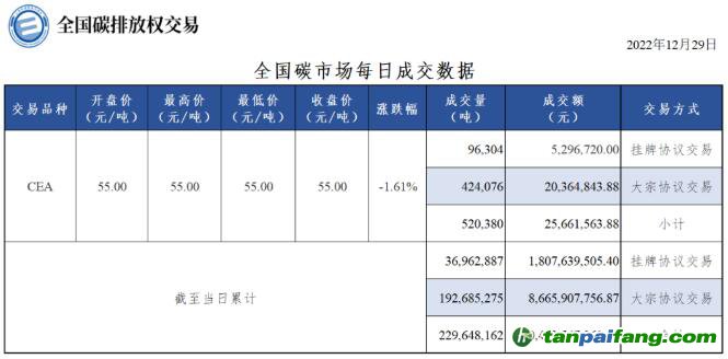 截至今日,全國碳市場碳排放配額(CEA)累計成交量229,648,162噸,累計成交額10,473,547,262.27元。