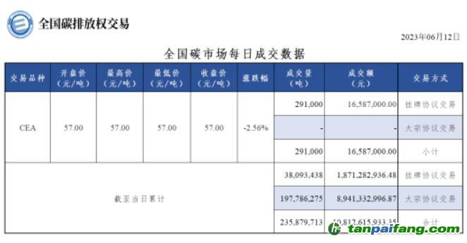 截至今日,全國碳市場碳排放配額(CEA)累計成交量235,879,713噸,累計成交額10,812,615,933.35元。