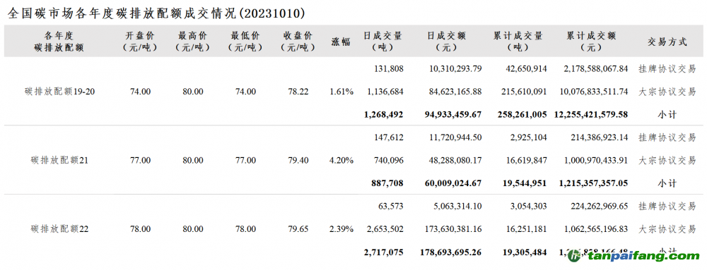 10月10日掛牌協議交易成交量342,993噸,成交額27,094,552.39元;大宗協議交易成交量4,530,282噸,成交額306,541,627.21元。 本+文內.容.來.自:中`國`碳`排*放*交*易^網 ta np ai fan g.com