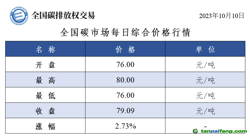 10月10日全國碳市場綜合價格行情為: 開盤價76.00元/噸,最高價80.00元/噸,最低價76.00元/噸,收盤價79.09元/噸,收盤價較前一日上漲2.73%。 本+文+內/容/來/自:中-國-碳-排-放(交—易^網-tan pai fang . com
