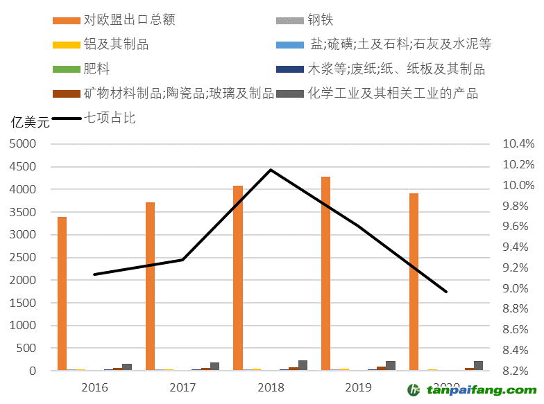 中國(guó)對(duì)歐盟出口中當(dāng)前歐盟CBAM所涉行業(yè)金額占比 本`文@內(nèi)-容-來(lái)-自;中^國(guó)_碳0排0放^交-易=網(wǎng) ta n pa i fa ng . co m