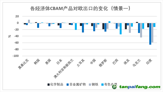 其它幾個(gè)主要發(fā)展中國(guó)家可能受到更大的影響。極端情景下的歐盟CBAM方案將拖累俄羅斯的GDP 0.64%,烏克蘭GDP 0.74%,印度、埃及和土耳其的GDP分別近0.3%。另外,一些發(fā)展中的小國(guó)的高碳商品的出口在這些國(guó)家的GDP總量中占有很大份額,例如莫桑比克的鋁和鋼鐵制品的出口占GDP的比重較大。因此在這種情景下,CBAM將拖累莫桑比克GDP 2.5%。 本`文@內(nèi)-容-來(lái)-自;中_國(guó)_碳排0放_(tái)交-易=網(wǎng) t an pa ifa ng . c om
