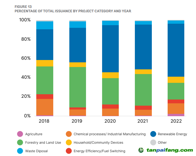 從碳信用市場(chǎng)的項(xiàng)目供應(yīng)結(jié)構(gòu)來(lái)看,目前的供應(yīng)仍主要集中在來(lái)自可再生能源活動(dòng)的信用,自2018年以來(lái),來(lái)自可再生能源活動(dòng)的信用發(fā)放量的百分比一般都在增加,到2022年,發(fā)行的信用中有55%是來(lái)自可再生能源活動(dòng)。